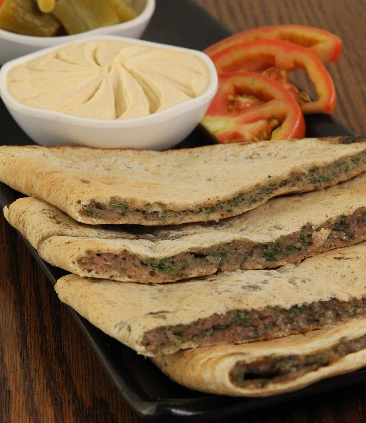 100 grams of kofta, hummus, Biwaz salad, tomato