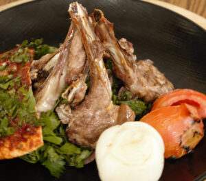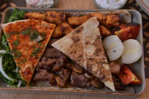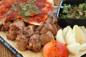 18 kebab skewers (with spicy) + Biwaz salad + grilled tomatoes and onions + spicy bread